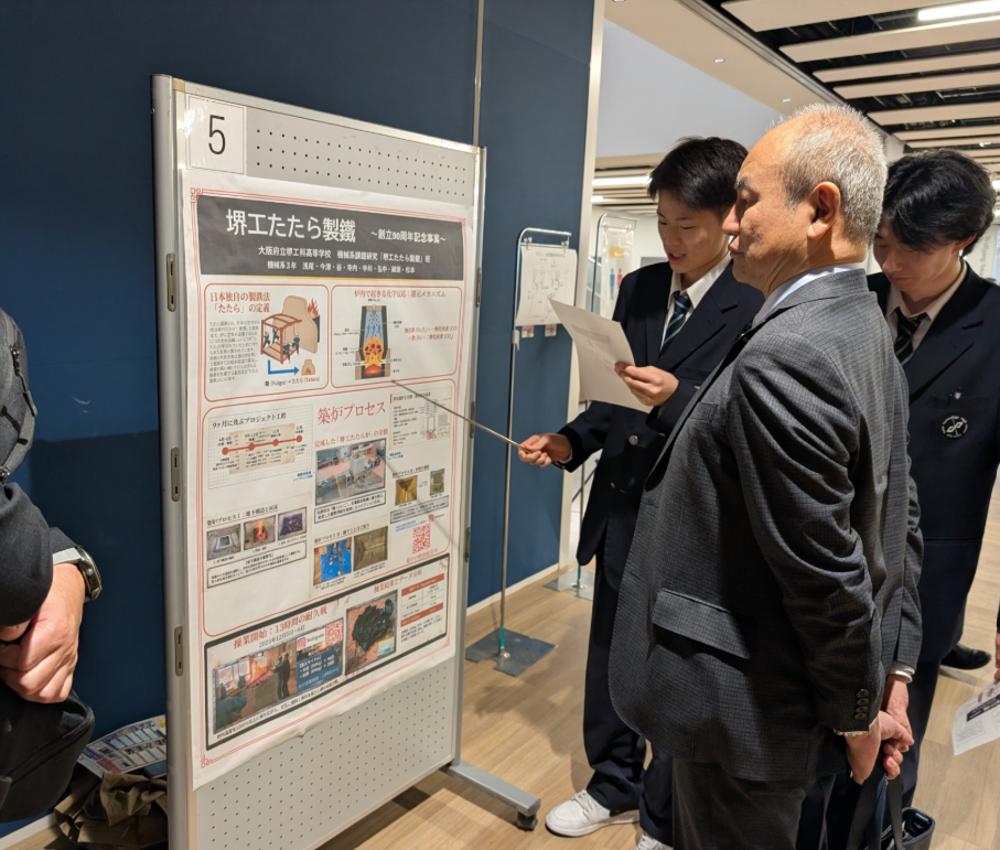 そのなかで、堺工科生は堺工90周年記念「たたら製鐵」の成果を発表、説明をさせていただいたトップは、なんとなんと、学長先生でありました。生徒も緊張です。